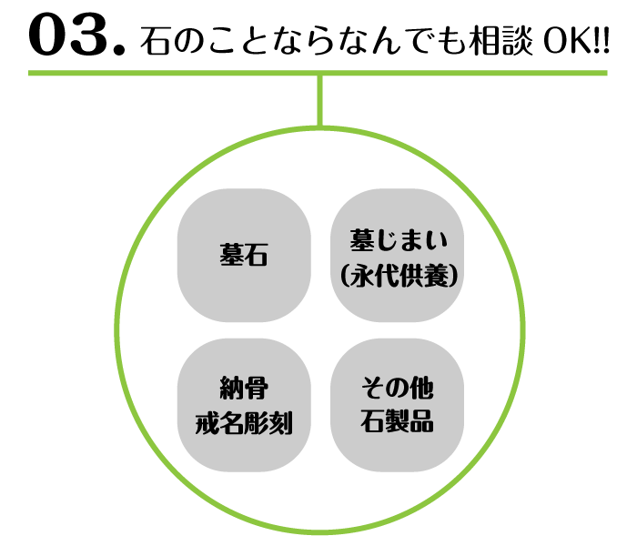 さまざまな石材に関すること、何でもご相談ください。石材のことやお墓のことであれば、種類は問いません。